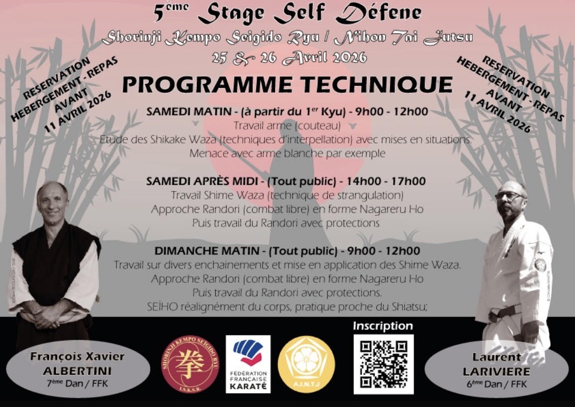 Deux jours de travail intensif sous la direction de François Xavier Albertini (7ème Dan) et Laurent Larivière (6ème Dan), deux techniciens de haut niveau pour un programme ancré dans la self-défense réelle.
